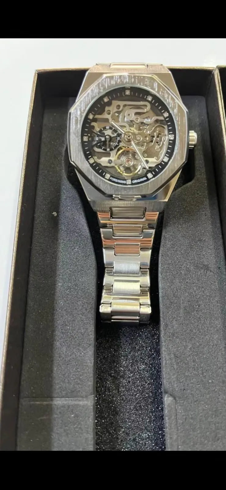 Sumérgete en un mundo de precisión y estilo con el Reloj Esqueleto Forsining. Con movimiento automático de cuerda automática, este elegante reloj asegura que nunca pierdas un momento. Su resistencia al agua te permite estar libre de preocupaciones por salpicaduras diarias, mientras que la estructura de acero inoxidable complementa cada conjunto con un toque sofisticado. Invita cumplidos con su diseño impactante y aprecia la pantalla luminosa que te mantiene a tiempo en cualquier luz. Eleva tu colección con un reloj que personifica lujo y funcionalidad.